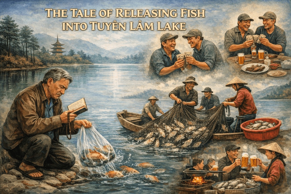 Tôi quen một ông bạn có thói quen mỗi ngày rằm đều mua một bọc cá ra hồ Tuyền Lâm để thả.