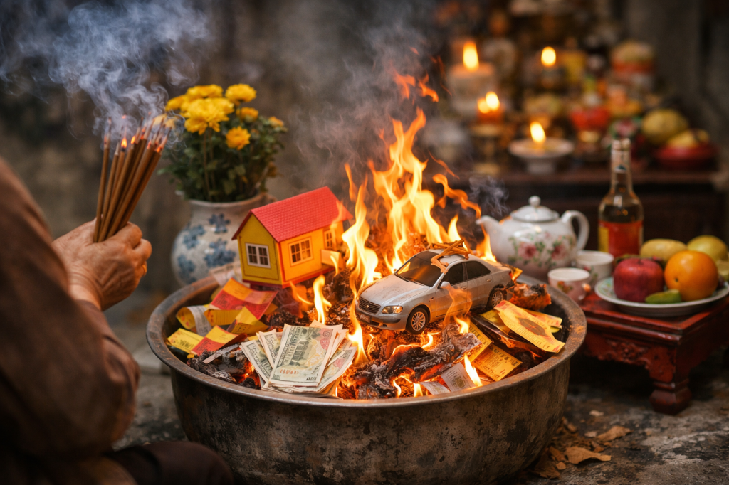 Có lẽ ai trong chúng ta cũng từng thấy cảnh người đời đốt vàng mã: nào là nhà lầu, xe hơi, quần áo, tiền bạc… Tất cả đều gửi “cho người khuất” với mong ước họ được sung túc nơi cõi bên kia. Nhưng… liệu họ có thực sự nhận được những món đồ ấy?