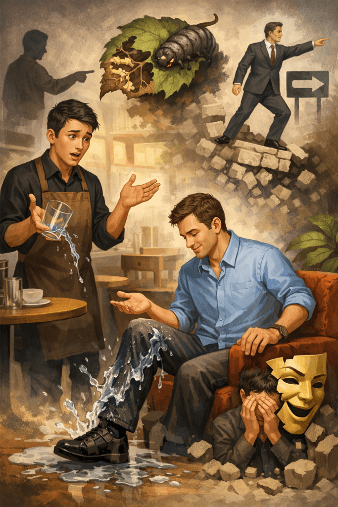 Người nhân viên lãng tránh trách nhiệm và bắt đầu đổ lỗi cho hoàn cảnh là do trong ly có nước nên mới đổ lên chân khách. Chứ không phải là do anh ta bất cẩn.