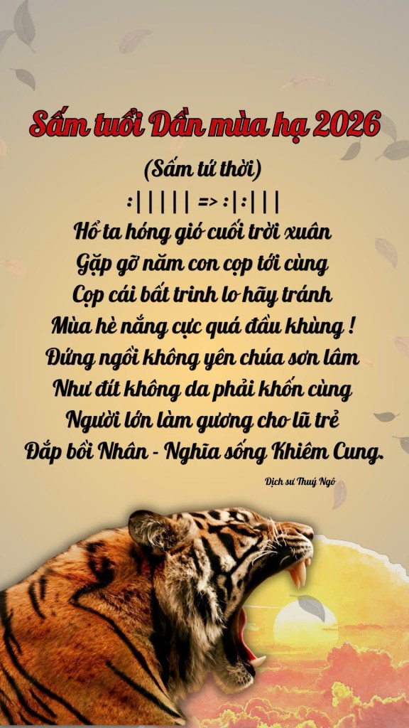 Sấm tuổi Dần mùa hạ 2026 🐯🐯🐯 Đăng bởidichsuthuyngo22 Tháng Tư, 202622 Tháng Tư, 2026Đăng trongKhải Tượng, Sấm, Thơ Chia sẻ: Chia sẻ trên X (Mở trong cửa sổ mới) X Chia sẻ lên Facebook (Mở trong cửa sổ mới) Facebook Thích Đang tải...